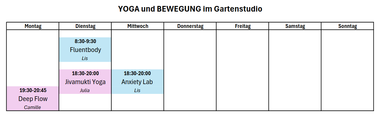 Treffpunkt ist 15min vor Kursbeginn im Yogaraum im Gartenstudio.
