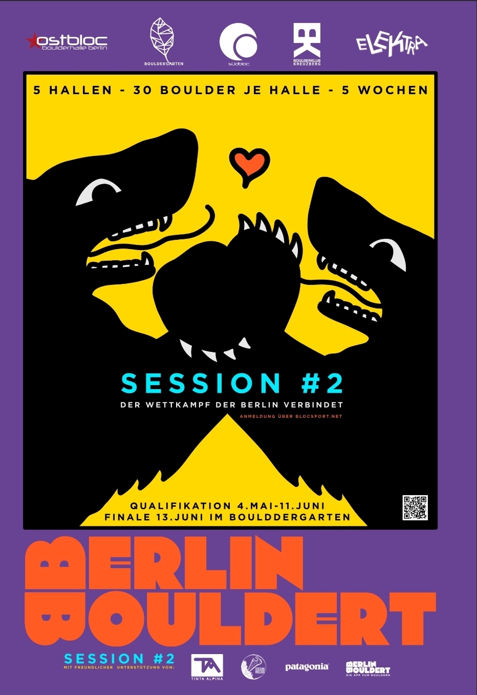 Die BerlinBouldert Session geht in die zweite Runde und wird noch fetter! 5 Hallen, 5 Wochen und ein großes Finale! Es werden 30 Boulder je Halle geschraubt (insgesamt 150 Wettkampfboulder) und ihr könnt vom 4.Mai ab 19Uhr bis zum 11.Juni um 23Uhr die Boulder projektieren, abhaken und eintragen. Gestartet wird in vier Kategorien: Open, Flinta*, Ü45 und U14. Jeweils die sechs besten aus den Kategorien Open und Flinta* werden am Samstag, dem 13.Juni um 20Uhr im Bouldergarten in das Finale einziehen. Die Gewinner*innen von Ü45 und U14 werden direkt per Ranking entschieden.