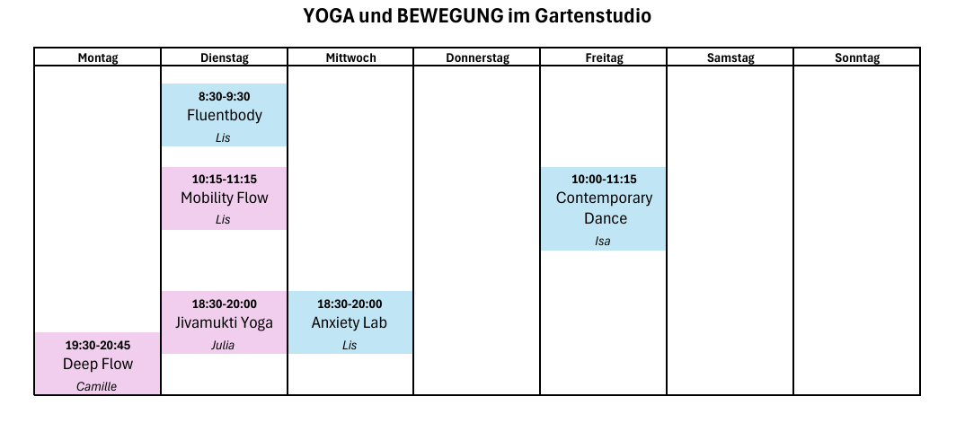 Treffpunkt ist 15min vor Kursbeginn im Yogaraum im Gartenstudio.